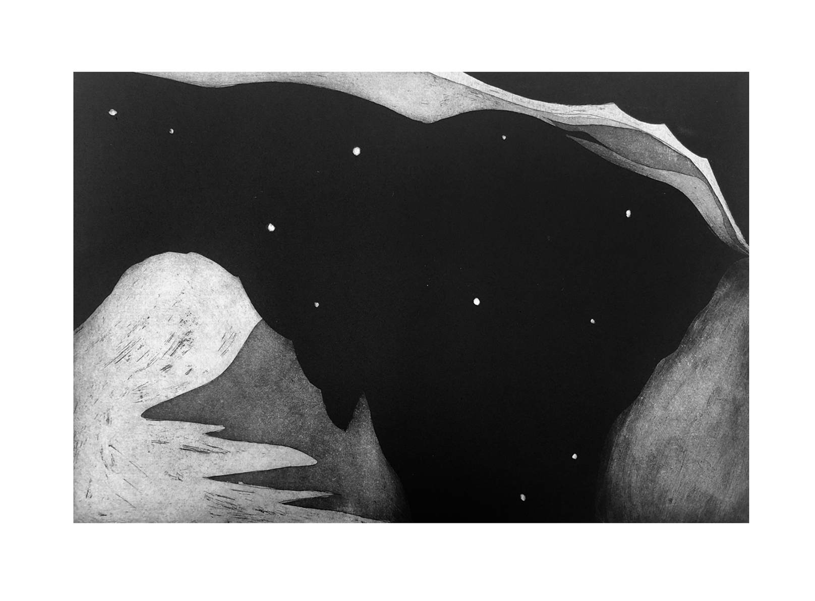 Grace Hailstone’s work is rooted in the subject of surreal and imagined landscapes – caves, volcanic lands, and geological forms, often linked to lived experiences and memories of places. Her process starts with making drawings in tandem with music, in a state of reverie. Using printmaking techniques including etching, linocut and wood engraving, Grace creates images with contrasting lines and shapes and considered introduction of colours and textures, interpreting the experience of landscapes suspended between reality and fiction.