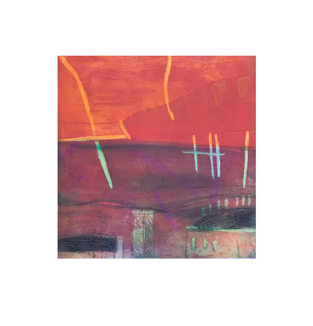 She uses vivid colour as an intuitive response to landscape. Her technique involves using deep velvety tones that contrast with delicate, spontaneous etched lines and textures. This technique is a vital tool for her to describe the light and atmosphere of a particular place, making it tangible to the viewer. This loose imagery and semi-abstract taps into the viewers shared memory of the landscape.