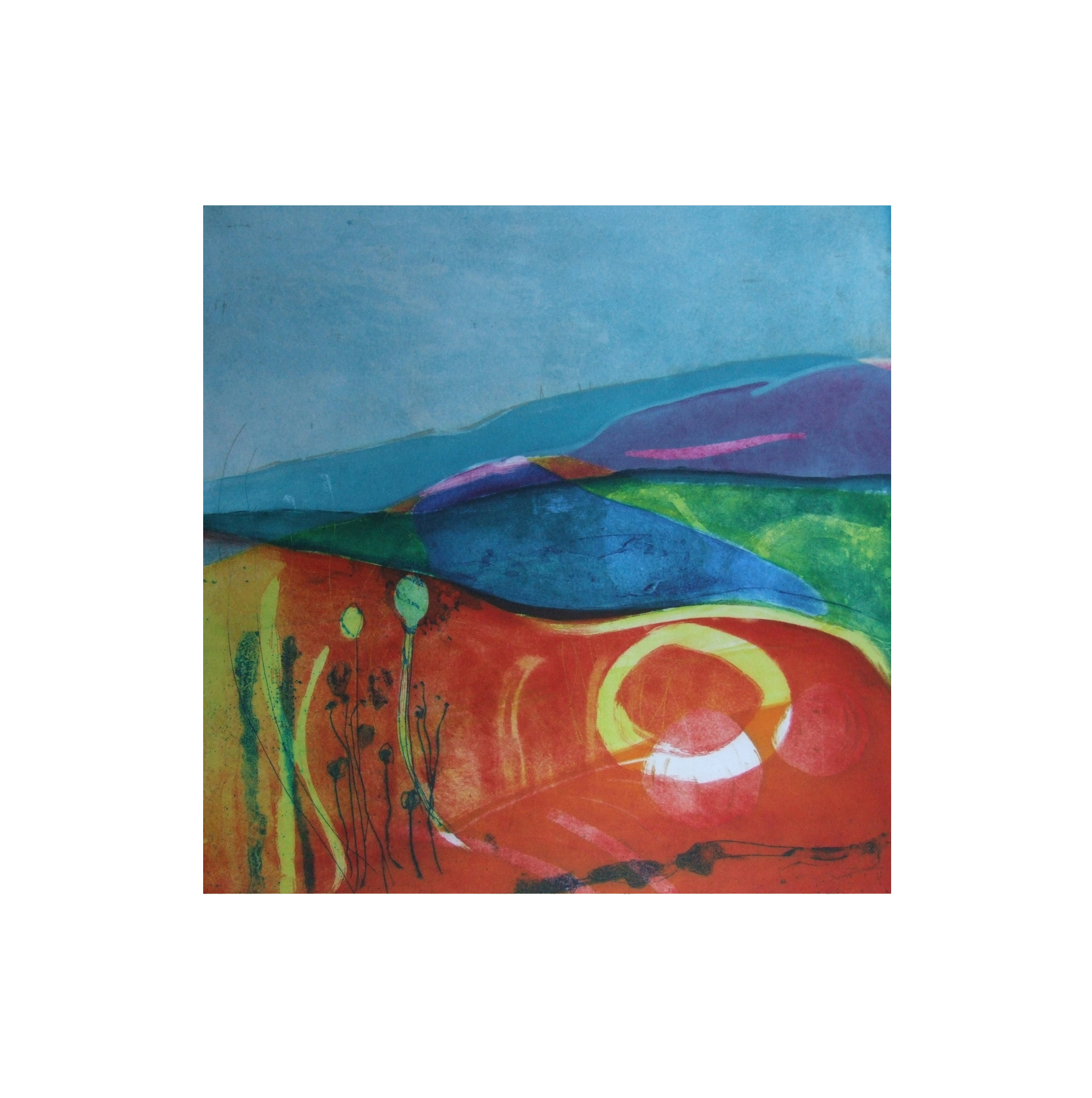 She uses vivid colour as an intuitive response to landscape. Her technique involves using deep velvety tones that contrast with delicate, spontaneous etched lines and textures. This technique is a vital tool for her to describe the light and atmosphere of a particular place, making it tangible to the viewer. This loose imagery and semi-abstract taps into the viewers shared memory of the landscape.
